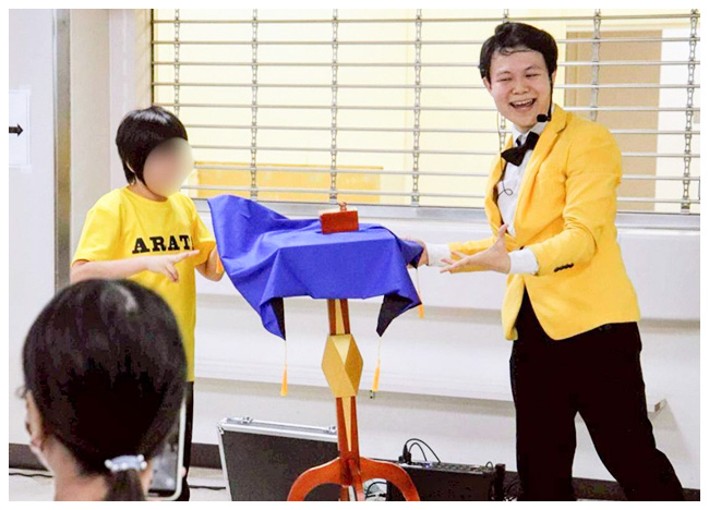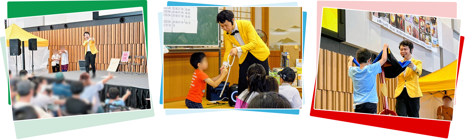 マジシャンガンジーのマジックは、ただ「見る」だけのショーではありません。子どもたちが声を出し、前のめりに参加し、大人もつい笑ってしまう――。まさに会場全体がひとつにな、参加型エンターテインメント!イベントの種類や規模に合わせて構成を変えながら、どんな場でもその日一番の盛り上がりをつくります。
